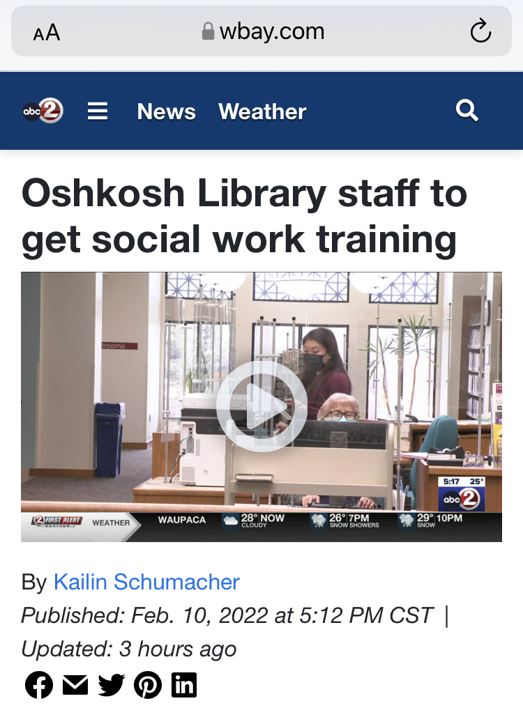 OtherOshkosh library staff to get social work training February 10, 2022 Sara Z https://www.wbay.com/2022/02/10/oshkosh-library-staff-get-social-work-training/ Share this: Click to share on X (Opens in new window) X Click to share on Facebook (Opens in new window) Facebook Like Loading...